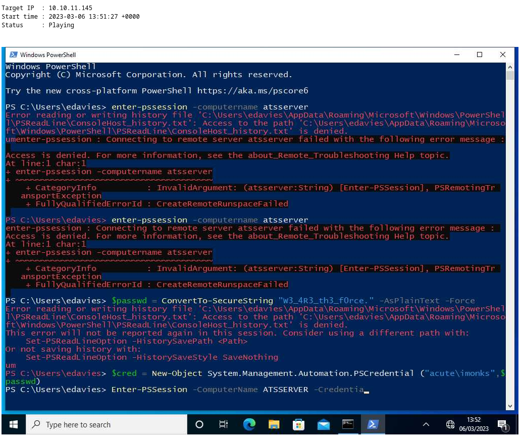 PS C:\Users\edavies\Documents> $Cred = New-Object System.Managemetn.Automation.PSCredential("acute\Awallace", $SecPass)