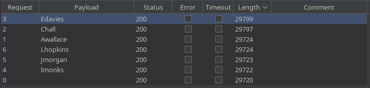 Con el Intruder de BurpSuite llego a la conclusión de que el usuario válido es Edavies