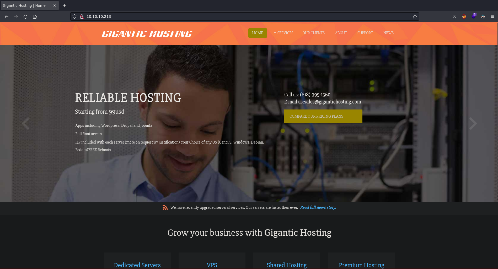http://10.10.10.213 [200 OK] Bootstrap, Country[RESERVED][ZZ], Email[sales@gigantichosting.com], HTML5, HTTPServer[Microsoft-IIS/10.0], IP[10.10.10.213], JQuery, Microsoft-IIS[10.0], Script[application/x-javascript,text/javascript], Title[Gigantic Hosting | Home]