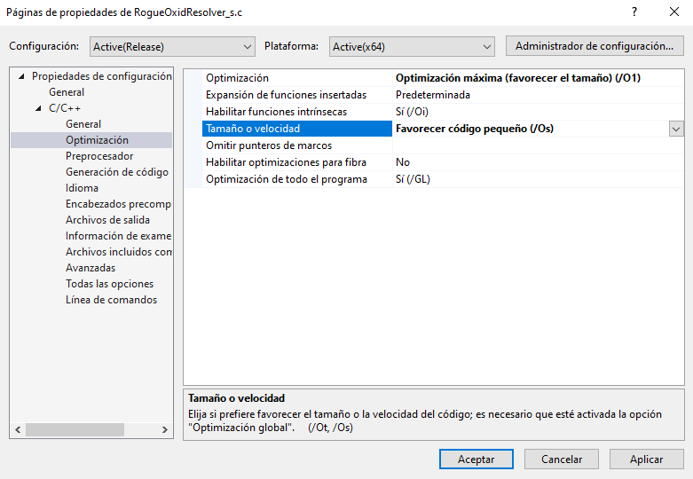 En los ajustes de compilación, viene predeterminado optimizar con respecto a la velocidad. Lo cambio al tamaño para poder borrar así restos que no afecten a la ejecución del programa pero que sí pueden ser rastreados