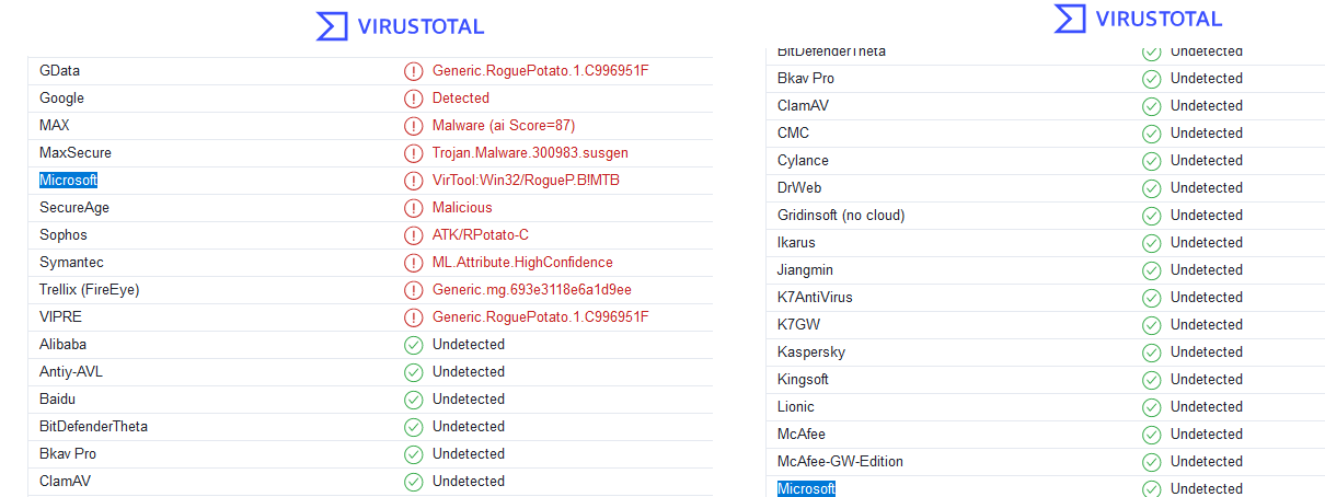 Para comprobar de una manera más rápida si el binario lo va a detectar como malicioso o no, desde Virustotal filtrando por Microsoft se puede saber