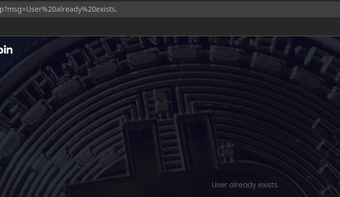 Pruebo a registrar al usuario admin:admin. Aparece que ya existe. Pero el mensaje de error lo puedo modificar en un parámetro por GET