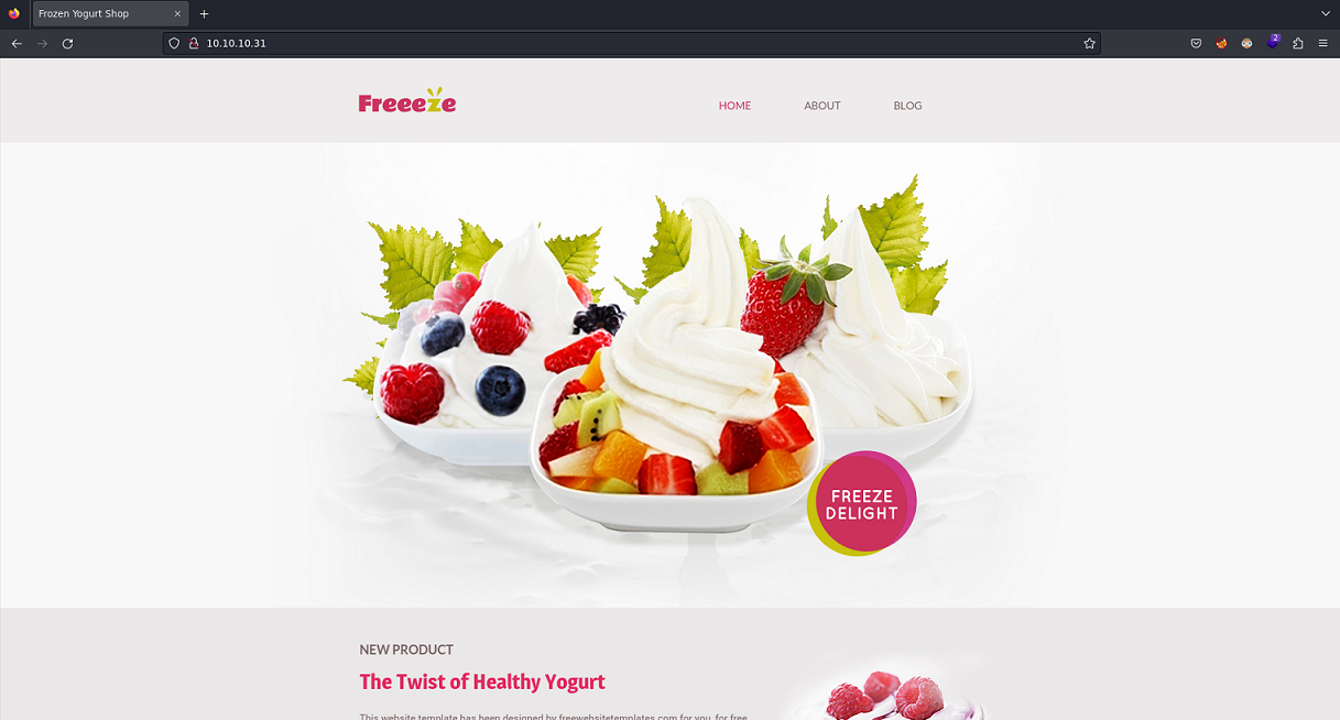 http://10.10.10.31 [200 OK] Apache[2.4.18], Country[RESERVED][ZZ], HTML5, HTTPServer[Ubuntu Linux][Apache/2.4.18 (Ubuntu)], IP[10.10.10.31], PoweredBy[:], Script[text/javascript], Title[Frozen Yogurt Shop]