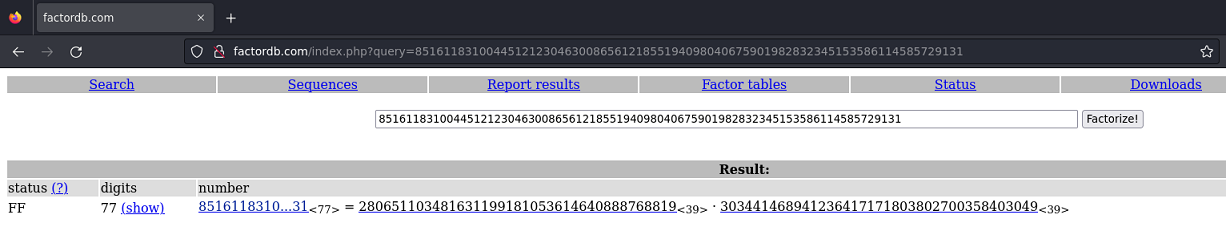 Utilizo factordb para factorizar "n" y obtener "p" y "q"