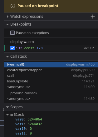 Pruebo una inyección XSS en el texto de la nota, pero no se acontece. Aparece el nombre de usuario en la parte superior. Recargo la página y desde las herramientas de desarrolador, encuentro un archivo display.wasm que llama la atención
