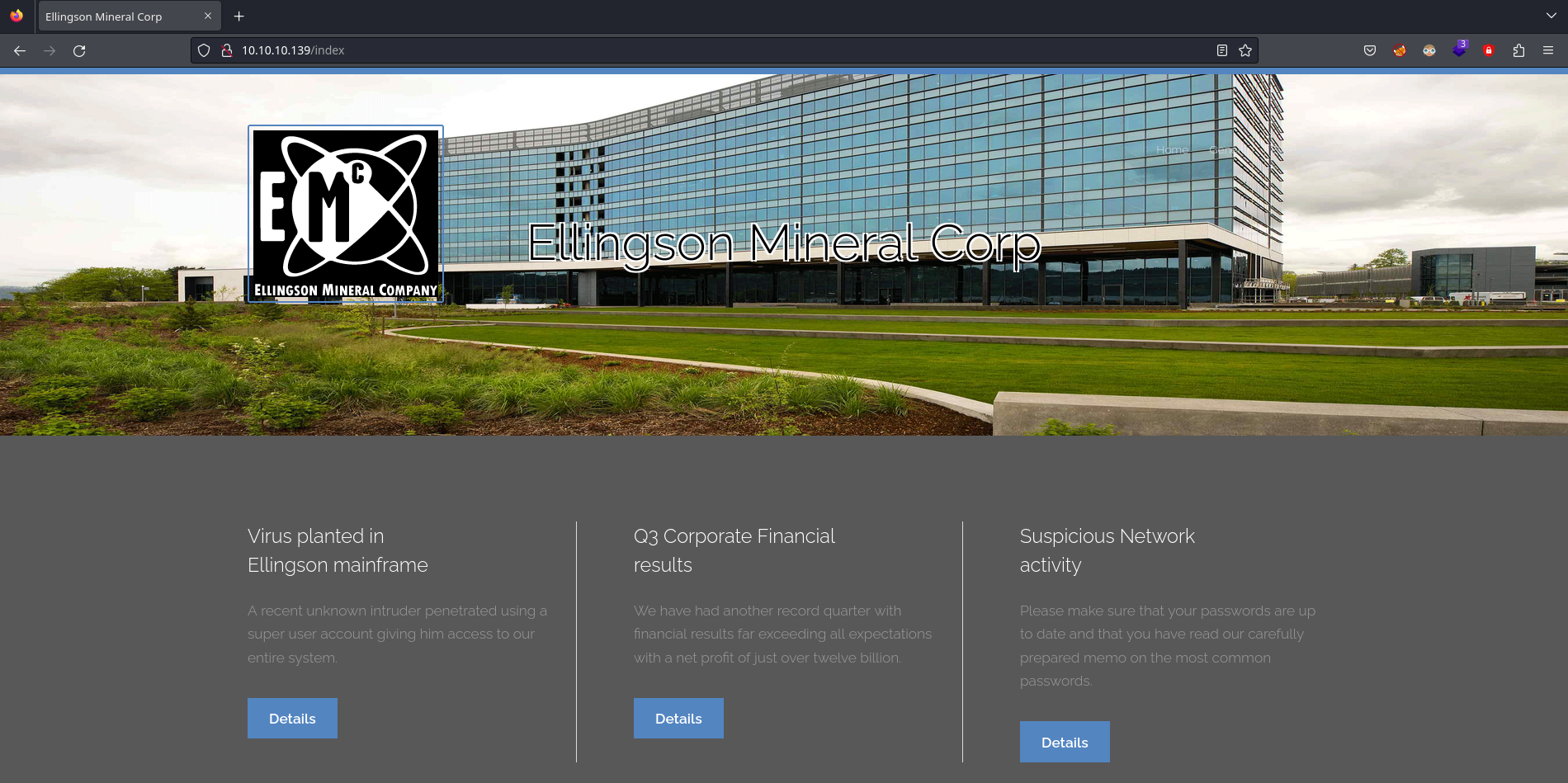 http://10.10.10.139/index [200 OK] Country[RESERVED][ZZ], HTML5, HTTPServer[Ubuntu Linux][nginx/1.14.0 (Ubuntu)], IP[10.10.10.139], JQuery, Script, Title[Ellingson Mineral Corp], nginx[1.14.0]