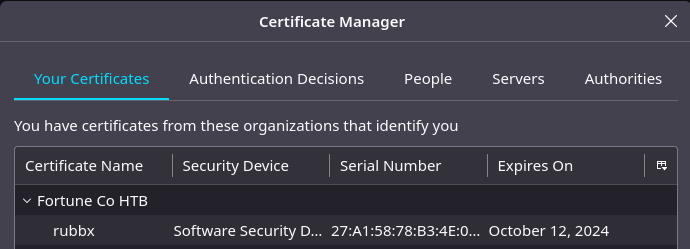 issuer=C = CA, ST = ON, O = Fortune Co HTB, CN = Fortune Intermediate CA, emailAddress = bob@fortune.htb
