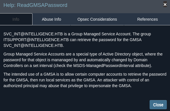 El usuario Ted.Graves miembro del grupo ITSupport, tiene capacidad de ReadGMSAPassword sobre svc_int, por lo que puedo dumpear la contraseña del Service Account