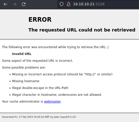 http://10.10.10.21:3128 [400 Bad Request] Content-Language[en], Country[RESERVED][ZZ], Email[webmaster], HTTPServer[squid/3.5.12], IP[10.10.10.21], Squid-Web-Proxy-Cache[3.5.12], Title[ERROR: The requested URL could not be retrieved], UncommonHeaders[x-squid-error], Via-Proxy[1.1 joker (squid/3.5.12)], X-Cache[joker,joker:3128]