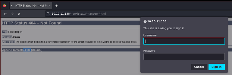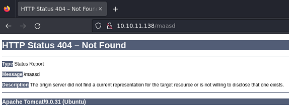 Al introducir una ruta que no existe, aparece una versión del Tomcat. Sin embargo, el escaneo del nmap reportaba un Apache. Esto se debe a que se está utilizando el Apache como Reverse Proxy