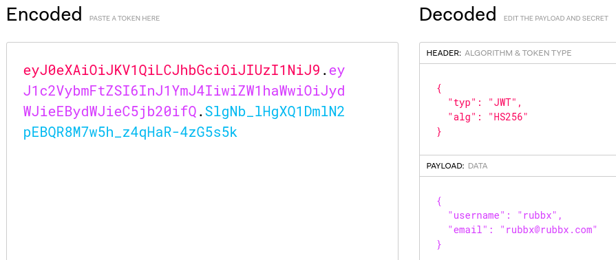 "eyJ0eXAiOiJKV1QiLCJhbGciOiJIUzI1NiJ9.eyJ1c2VybmFtZSI6InJ1YmJ4IiwiZW1haWwiOiJydWJieEBydWJieC5jb20ifQ.SlgNb_lHgXQ1DmlN2pEBQR8M7w5h_z4qHaR-4zG5s5k"