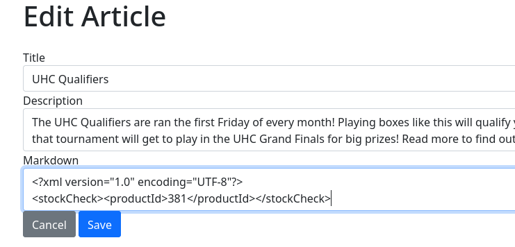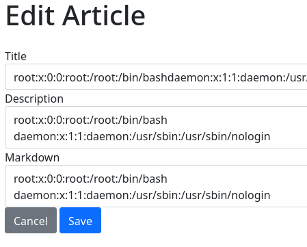 La sección de editar artículos es vulnerable a una inyección XML. Sin embargo, desde aquí no lo puedo derivar a un XXE
