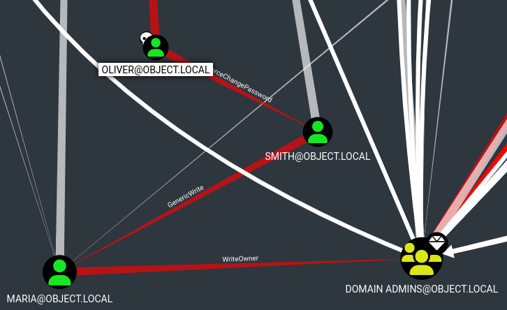 El usuario oliver tiene ForceChangePassword sobre que smith, puede hacer GenericWrite sobre maria, que a su vez tiene WriteOwner sobre Domain Admins