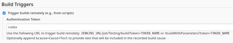 curl -s -X GET 'http://rubbx:11a8956263bda19798dacf5911460d759c@10.10.11.132:8080/job/Testing/build?token=rubbx'